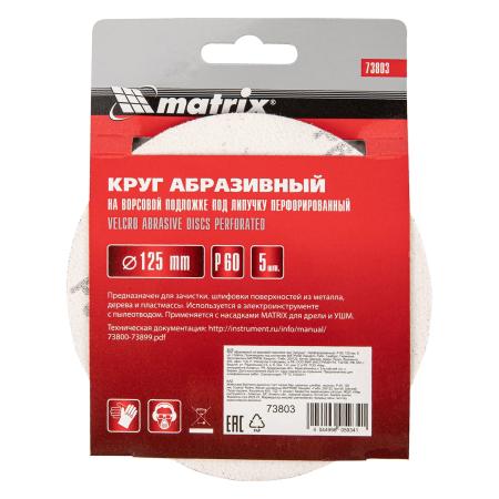 Круг абразивный на ворсовой подложке под "липучку", перфорированный, P 60, 125 мм, 5 шт.// Matrix