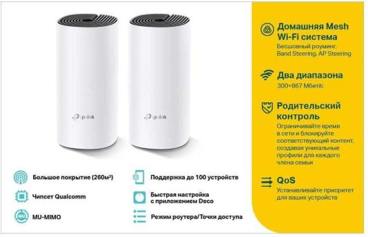 "Для бесперебойного доступа к Wi-Fi во всём доме Deco использует систему модулей — избавьтесь от ""мертвых зон"" раз и навсегда! Комплект Deco E4 с двумя устройствами обеспечивает покрытие до 260 кв.м. Если этого недостаточно – просто добавьте в сеть больше модулей Deco для увеличения покрытия." «Deco Е4 обеспечивает быстрое и стабильное соединение со скоростью до 1167 Мбит/с и работает с основными интернет-провадерами и модемами. Deco способен поддерживать работу даже самой загруженной сети, обеспечивая одновременное соединение для более чем 100 устройств.»