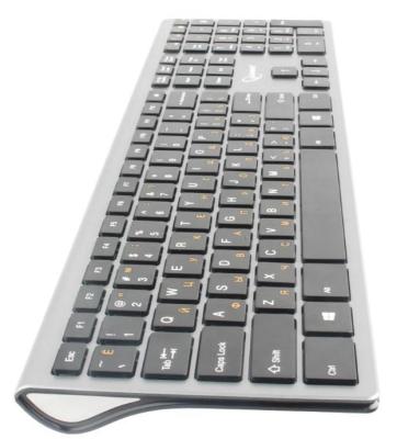 Эта элегантная серебристая клавиатура станет отличным дополнением к вашему рабочему месту. Благодаря беспроводному подключению через USB-приемник вы сможете освободить пространство на столе от лишних проводов.