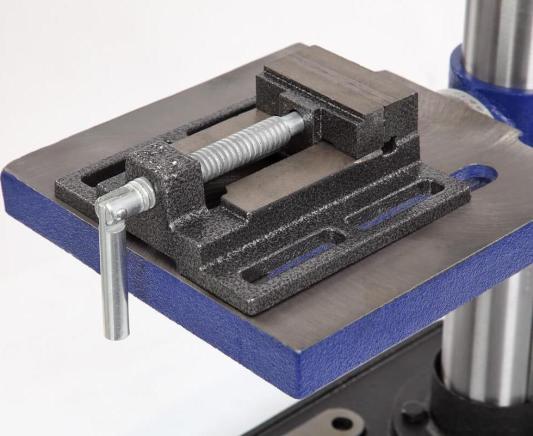 Заготовку можно крепить как к рабочему столу, так и к основанию, все зависит от ее размера. В комплекте предусмотрены тиски. Для их крепления есть по два паза на рабочем столе и на основании. Шкала, расположенная на рукоятке регулировки глубины сверления, показывает ход пиноли шпинделя, с ее помощью можно настраивать ход пиноли, для этого необходимо провернуть шкалу, стрелка на корпусе будет показывать значение, на которое будет возможно погружение сверла, затем затянуть барашек. Наконечники тройной рукояти удобной формы, что способствует плавной подаче сверла к заготовке.