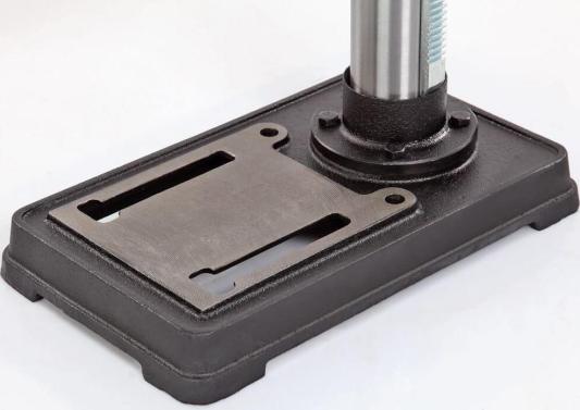 Модель DP250-16 простая, но обладает целым рядом достоинств. Стол, опора и корпус сверлильной головки выполнены из чугуна, что придает оборудованию серьезный вес - 30 килограмм. Двигатель асинхронный, мощностью 500 Вт. Станок высокий – 855 мм, подходит для обработки заготовок большой толщины. Максимальное расстояние между шпинделем и столом – 430 мм.