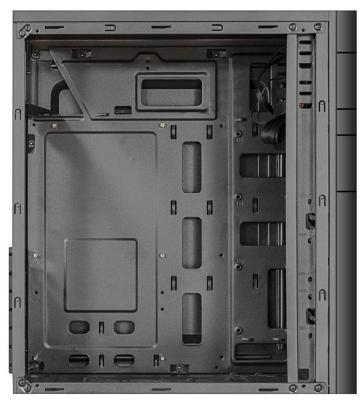 Особое внимание уделено системе охлаждения: корпус имеет место для установки 80 мм вентилятора сзади и двух 120 мм вентиляторов спереди, что обеспечивает эффективный воздушный поток и поддержание оптимальной температуры компонентов.