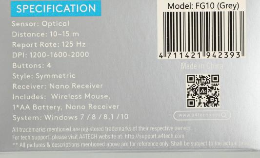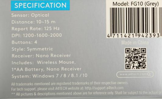 Мышь беспроводная A4TECH FG10 GREY чёрный серый USB