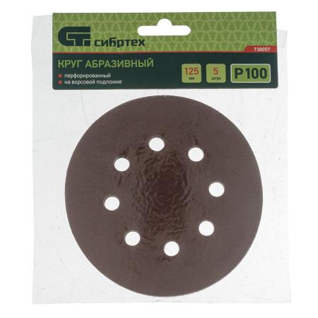 Круг абразивный на ворсовой подложке под "липучку", перфорированный, P 100, 125 мм, 5 шт.// Сибртех