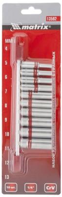 Набор удлиненных торцевых головок 1/4", 6-ти гр., CrV, 10шт., 4-13мм// Matrix