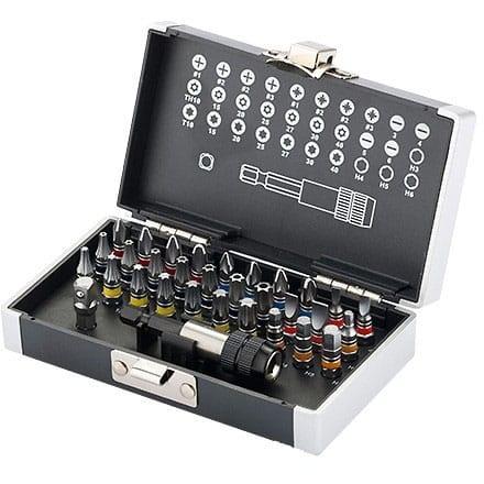 В наборе 30 бит со шлицами PH1, PH2, PH3, PZ1, PZ2, PZ3, T10, T15, T20, T25, T27, T30, T40, H3, H4, H5, H6, SL3, SL4, SL5, SL6, ТН10, ТН15, ТН20, ТН25, ТН27, ТН30 и ТН40, которые являются наиболее востребованными при проведении различных работ.