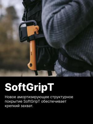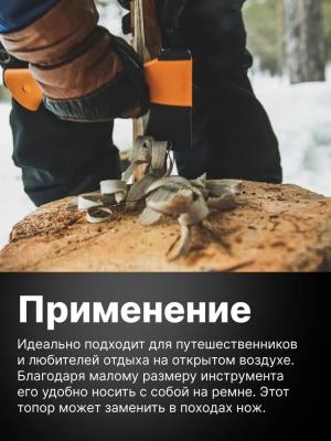 Топор Fiskars X5 - XXS 480гр оснащен нескользящим покрытием, которое обеспечивает надежную трACTION на любой поверхности. Эргономичная ручка из стекловолокна и FiberComp сделана для удобства использования и предохраняет от травм рук.