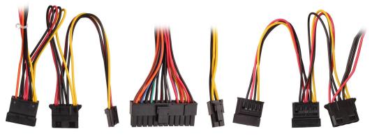 Этот блок питания оснащен всеми необходимыми разъемами для подключения различных компонентов: 24+4 pin для материнской платы, 6+2 pin для видеокарты, а также разъемы SATA, Molex и FDD. Такой набор позволяет легко собрать систему с различной конфигурацией.