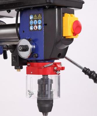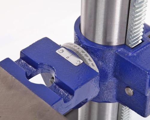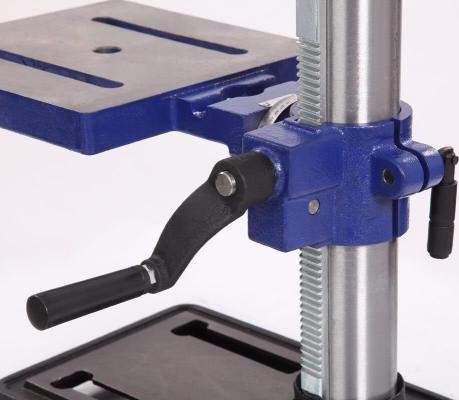 Патрон быстрозажимной с максимальным диаметром зажимаемого хвостовика инструмента 16 мм. Диаметр стойки (колонны) 60 мм, имеется зубчатая рейка, поднятие/опускание стола настраивается с помощью рукоятки.