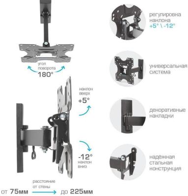 ДополнительноЛегкий монтаж при помощи съемной монтажной пластины. Надежная стальная конструкция. Универсальный телевизор на кронштейне можно наклонить, повернуть и сдвинуть к стене. Декоративные накладки. Кабель-канал.
