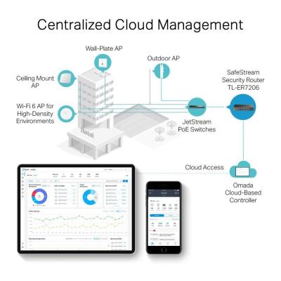 Интегрирован в Omada SDN: автоматическое назначение настроек (Zero-Touch Provisioning)‡, централизованное облачное управление и умный мониторинг.