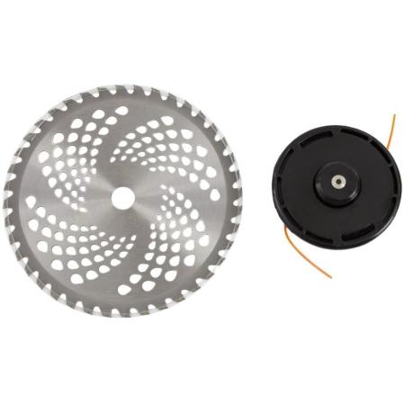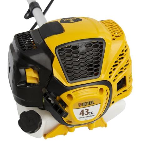 Прочие особенности и свойстваБензиновый Триммер Denzel DTL-43 предназначен для обработки газонов, подравнивания молодых кустарников, срезания сорняков и подпиливания небольших деревьев. Двигатель 2,5 л.с. обеспечивает скорость вращения насадок 9500 об/мин. В комплект входят 2 оснастки: катушка с леской (обеспечивает ширину скашивания 42 см) и остро заточенный пильный диск (25,5 см).