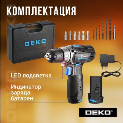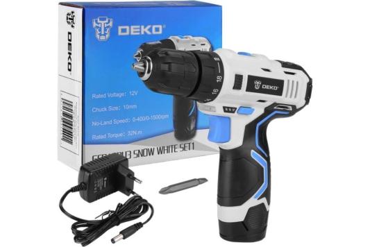 Прочие особенности и свойстваАккумуляторная дрель-шуруповерт DEKO GCD12DU3 SNOW WHITE SET1 063-4170 с 1 аккумулятором (1.5 А*ч) и зарядкой в коробке.