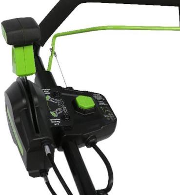 Для безопасного включения предусмотрена кнопка-предохранитель, как и на всей аккумуляторной технике Greenworks. Ручка имеет складную конструкцию. Снегоуборщик работает от аккумуляторной батареи 82V (2,5 или 5 Ампер/час), которую можно использовать с другими с устройствами Greenworks из линейки 82V.