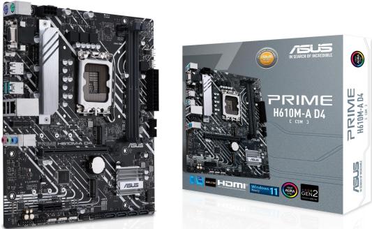 ASUS PRIME H610M-A D4-CSM, LGA1700, H610, 2*DDR4, D-Sub + DP + HDMI, SATA3, Audio, Gb LAN, USB 3.2*4, USB 2.0*6, COM*1 header (w/o cable), mATX ; 90MB19P0-M0EAYC