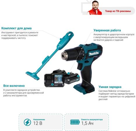 Makita CLX226X1 Набор инструмента,2шт-пылесос ак CL106FDZ+дрель ак DF333DZ+BL1016+з/у DC10WD,кор