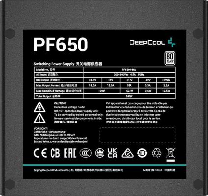 БП DEEPCOOL PF650 [R-PF650D-HA0B-EU] форм-фактора ATX получил сертификат энергоэффективности 80 PLUS Standart. Для стабильного отвода тепла под нагрузкой устройство оснащается активной системой охлаждения, в которую входит малошумный кулер размером 120x120 мм. Регулировка оборотов вентилятора осуществляется через ШИМ в соответствии с актуальным уровнем нагрузки БП.