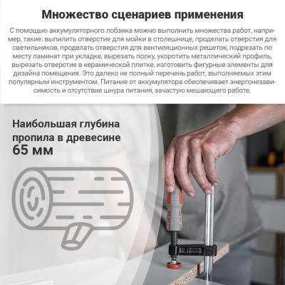 Литий-ионный аккумулятор мощности 18 В обеспечивает долгую работу без подзарядки. Рукоятка скобовидного типа удобна в держании и позволяет выполнять работы в любом положении. Это идеальный инструмент для любителей DIY, профессионалов и всех, кто ценит комфорт и эффективность при работе с деревом, металлом и алюминием.