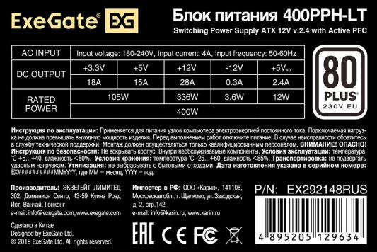 Блок питания 400W ExeGate 80 PLUS® 400PPH-LT (ATX, APFC, КПД 82% (80 PLUS), 12cm fan, 24pin, 4+4pin, PCI-E, 3xSATA, 3xIDE, RTL(color box), black)