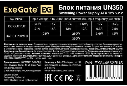 Блок питания 350W ExeGate UN350 (ATX, SC, 12cm fan, 24pin, 4pin, 3xSATA, 2xIDE, FDD, кабель 220V с защитой от выдергивания)