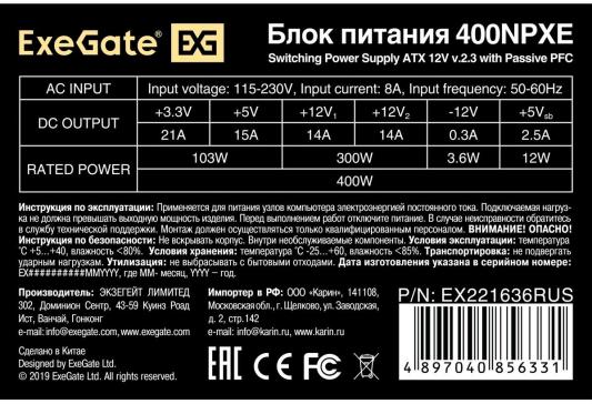Блок питания 400W ExeGate 400NPXE (ATX, PPFC, PC, 12cm fan, 24pin, 4pin, PCIe, 3xSATA, 2xIDE, FDD, black, кабель 220V в комплекте)