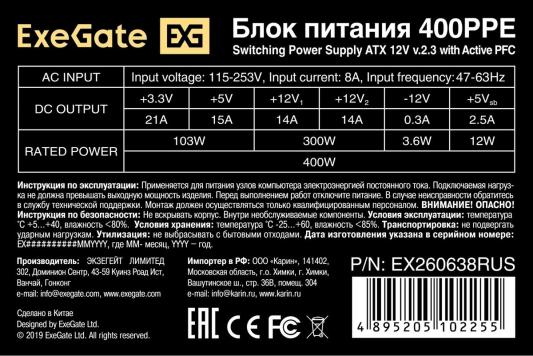 Блок питания 400W ExeGate 400PPE (ATX, APFC, PC, КПД 80% (80 PLUS), 12cm fan, 24pin, 4pin, PCIe, 5xSATA, 3xIDE, FDD, black, кабель 220V в комплекте)