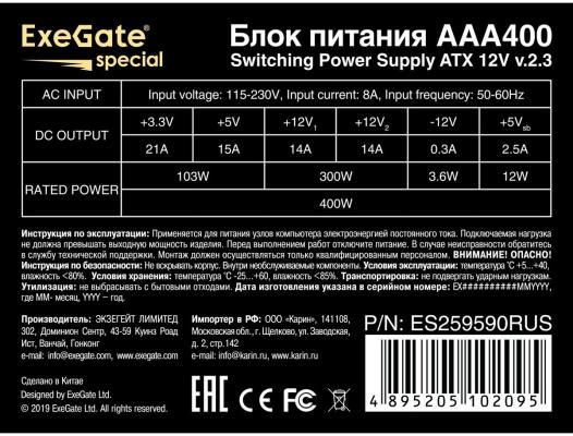 Блок питания 400W ExeGate AAA400 (ATX, SC, 8cm fan, 24pin, 4pin, 2xSATA, IDE, кабель 220V с защитой от выдергивания)