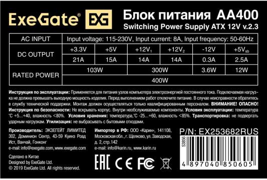 Блок питания 400W ExeGate AA400 (ATX, PC, 8cm fan, 24pin, 4pin, 2xSATA, IDE, кабель 220V в комплекте)