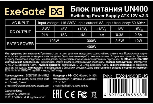 Блок питания 400W ExeGate UN400 (ATX, SC, 12cm fan, 24pin, 4pin, 3xSATA, 2xIDE, FDD, кабель 220V с защитой от выдергивания)