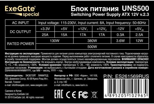 Блок питания 500W ExeGate UN500 (ATX, PC, 12cm fan, 24pin, 4pin, PCIe, 3xSATA, 2xIDE, FDD, кабель 220V в комплекте)