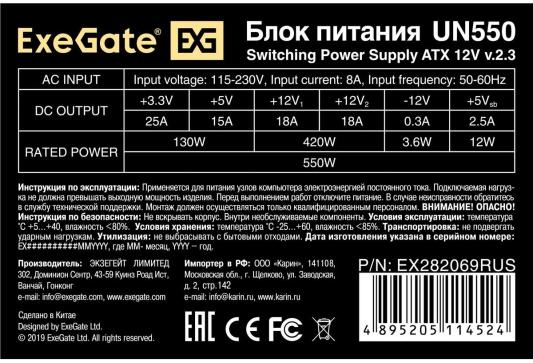Блок питания 550W ExeGate UN550 (ATX, PC, 12cm fan, 24pin, 4pin, PCIe, 3xSATA, 2xIDE, FDD, кабель 220V в комплекте)