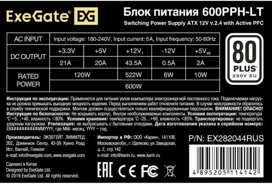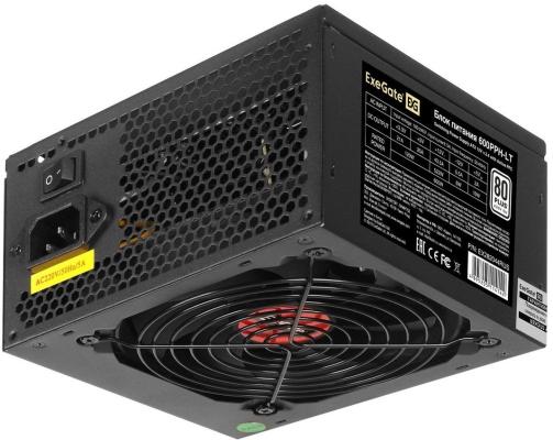 Блок питания 600W ExeGate 80 PLUS® 600PPH-LT-S-OEM (ATX, APFC, КПД 82% (80 PLUS)SC, 12cm fan, 24pin, (4+4)pin, PCIe, 5xSATA, 3xIDE, кабель 220V с защитой от выдергивания, black, RTL)