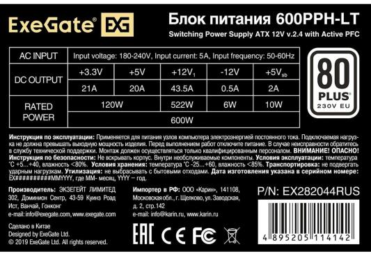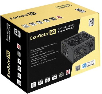 Блок питания 600W ExeGate 80 PLUS® 600PPH-LT-S (ATX, APFC, КПД 82% (80 PLUS)SC, 12cm fan, 24pin, (4+4)pin, PCIe, 5xSATA, 3xIDE, кабель 220V с защитой от выдергивания, black, RTL)