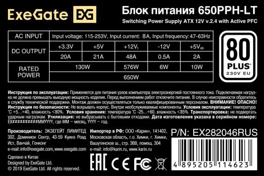Блок питания 650W ExeGate 80 PLUS® 650PPH-LT-S-OEM (ATX, APFC, КПД 82% (80 PLUS)SC, 12cm fan, 24pin, (4+4)pin, PCIe, 5xSATA, 3xIDE, кабель 220V с защитой от выдергивания, black, RTL)