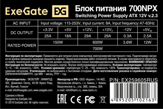 Блок питания 700W ExeGate 700NPX (ATX, PC, 12cm fan, 24pin, 4pin, PCIe, 3xSATA, 2xIDE, black, кабель 220V в комплекте)