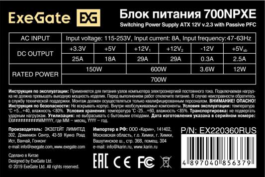 Блок питания 700W ExeGate 700NPXE (ATX, PPFC, PC, 12cm fan, 24pin, (4+4)pin, PCIe, 4xSATA, 3xIDE, FDD, black, кабель 220V в комплекте)