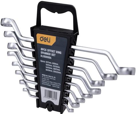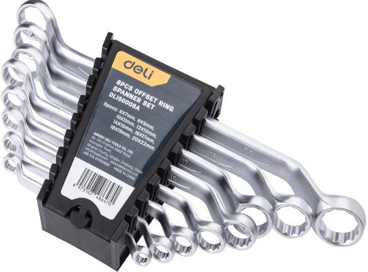 Набор накидных изогнутых гаечных ключей 8 шт Deli DL150008A Спецификация: 6x7мм, 8x9мм, 10x11мм, 12x13мм, 14x15мм, 16x17мм, 18x19мм, 20x22мм. Матовая хромированная поверхность. Пластиковая упаковка.