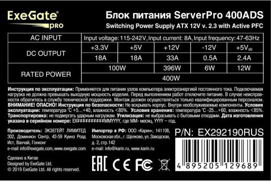Серверный БП 400W ExeGate ServerPRO-400ADS (ATX, APFC, КПД 82% (80 PLUS), 2x8cm fans, 24pin, (4+4)pin, PCIe, 9xSATA, black)