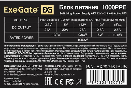 Прочие особенности и свойствамощность 1000 Вт, ATX12V 2.3, активный PFC, вентилятор 120 мм