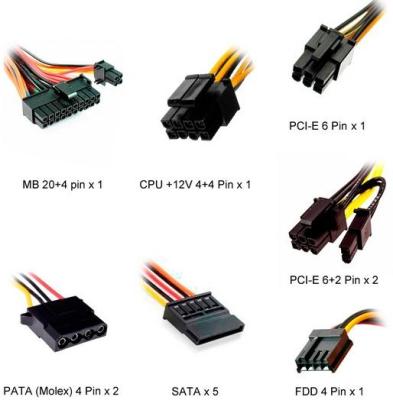 Блок питания оснащен всеми необходимыми разъемами: 20+4 pin для материнской платы, 2 x 6+2 pin для мощных видеокарт, 5 SATA и 2 Molex для накопителей и других устройств. Также имеется разъем для подключения FDD-устройств.