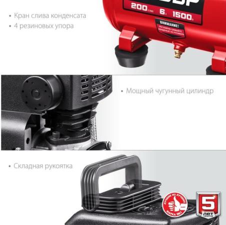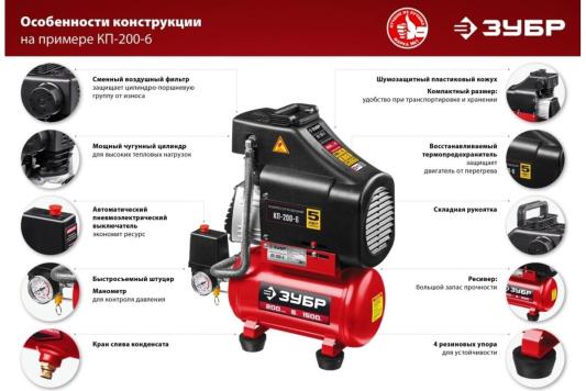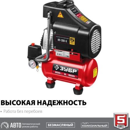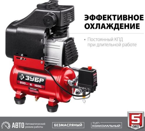 Компрессор воздушный безмасляный, 200 л/мин, 6 л, 1500 Вт, ЗУБР