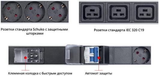 Блок розеток имеет 16 портов стандарта Schuko и 8 портов стандарта IEC 60320 C19 и имеет автомат защиты на 32А. Для подключения внешнего шнура (кабеля) предусмотрена клеммная колодка под провод номинальным сечением до 4 мм2. Блок розеток предназначен для установки в шкафы 34U и выше. Поставляется в индивидуальной упаковке с комплектом крепежа.