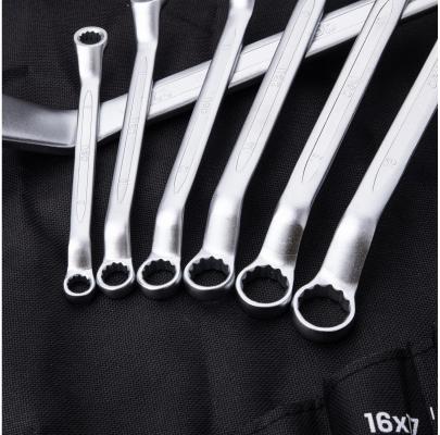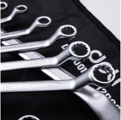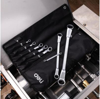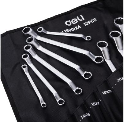 Набор накидных изогнутых гаечных ключей 12 шт Deli DL150012A Спецификация: 6x7, 8x9, 10x11, 12x13, 14x15, 16x17, 18x19, 20x22, 21х23, 24х27, 25х28, 30х32. Матовая хромированная поверхность. Чехол из ткани Oxford.