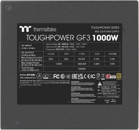 Прочие особенности и свойстваОснащенный японскими конденсаторами блок питания Thermaltake Toughpower GF3 1000W [PS-TPD-1000FNFAGE-4] характеризуется значительной (1000 Вт) номинальной выходной мощностью. Величина данного показателя делает оправданным применение устройства в ходе сборки производительного компьютера, в том числе – игрового ПК высокого класса. Блок питания исключительно надежен. В устройстве реализована поддержка технологий защиты OCP, OPP, OTP, OVP, SCP и UVP. Важным достоинством источника питания является высокая энергоэффективность. Модели присвоен сертификат 80 PLUS Gold.