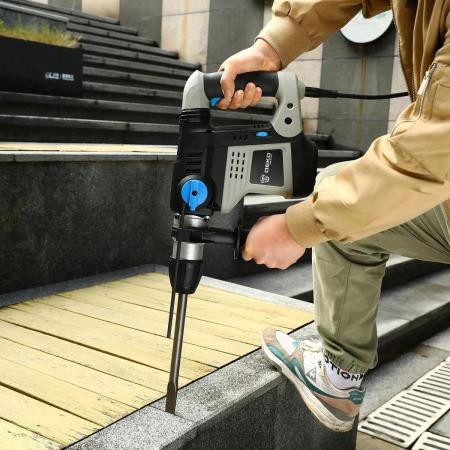 Прочие особенности и свойстваИнструмент предназначен для сверления отверстий в различных материалах (дерево, сталь, бетон, кирпич и т. д.) в режимах сверления и сверления с ударом, а также ударного долбления при установке соответствующего инструмента. Удобное переключение между режимами осуществляется при помощи тумблера. Патрон SDS-max обеспечивает быструю и легкую замену оснастки. Предохранительная муфта предотвратит поломки двигателя от перегрузки при достижении высокого крутящего момента. Для сверления отверстий нужной глубины в комплекте предусмотрен ограничитель. Наличие кейса решает проблему хранения и транспортировки.