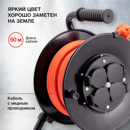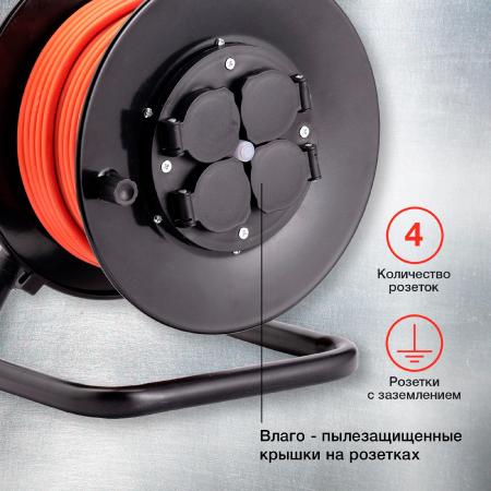 Удлинитель имеет форм фактор эргономичной катушки с подставкой и ручкой сверху. Сматывание и разматывание провода с ним происходит быстро и просто. Яркий кабель заметно на любом фоне, а выполнен он по технологии ПВС: у каждой медной жилы — собственная оплётка, плюс, внешняя для всех, устойчивая к воздействию внешней среды и выдерживающая даже большие перепады температур.