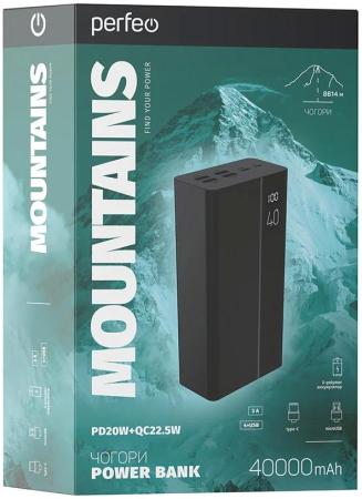 Perfeo Powerbank MOUNTAINS 40000 mAh/LED дисплей/PD + QC 3.0/Type-C/4 USB/Выход: 3A, max 22.5W/Black (PF_D0144)