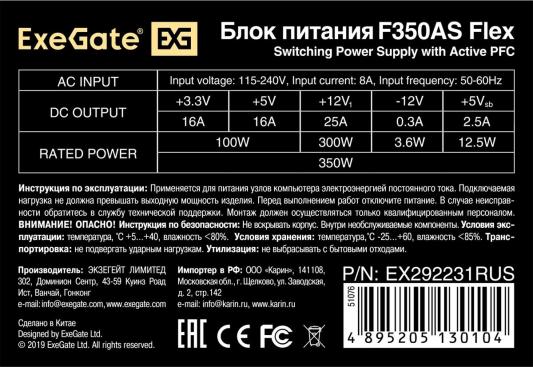 Блок питания 350W ExeGate F350AS (Flex ATX, for ITX case, APFC, КПД 80% (80 PLUS), 4cm fan, 24pin, (4+4)pin, PCI-E, 3xSATA, 2xIDE)