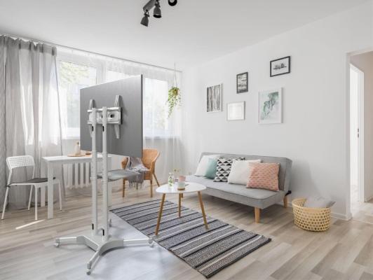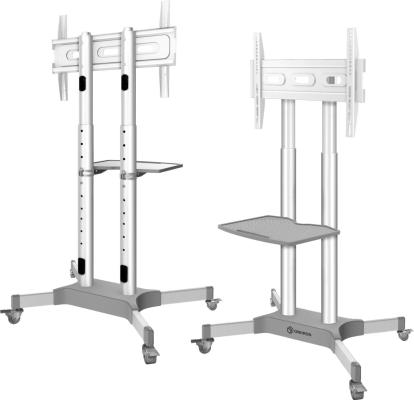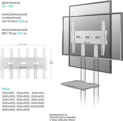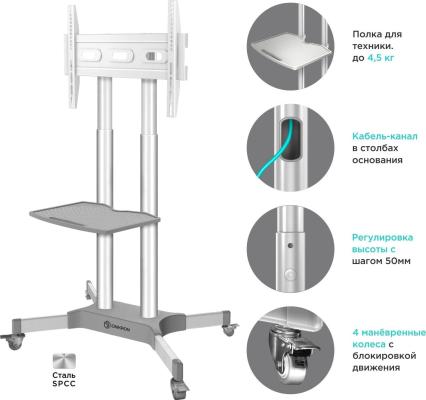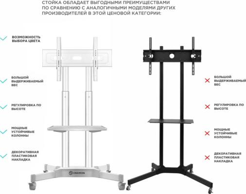 Мобильная стойка ONKRON на 1 ТВ/ 40-65" от 200х200 до 400х600 наклон 0? поворот 0? макс нагр 45,5кг Высота 1200-1500мм, кабель-канал, регулировка полки по высоте, колесики с блокировкой, белая