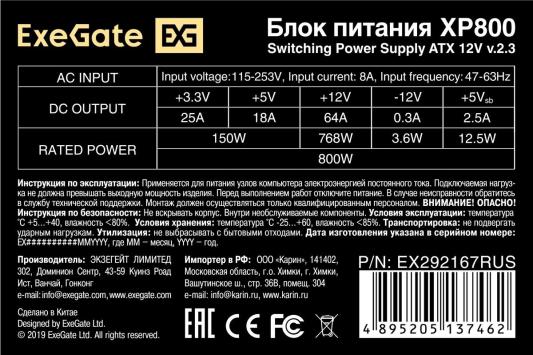 Блок питания 800W ExeGate XP800 (ATX, PC, 12cm fan, 24pin, 2x(4+4)pin, 2xPCI-E, 5xSATA, 3xIDE, black, кабель 220V в комплекте)